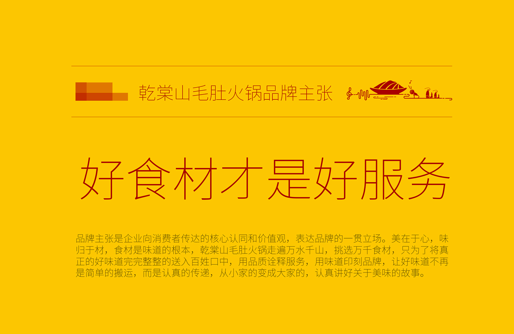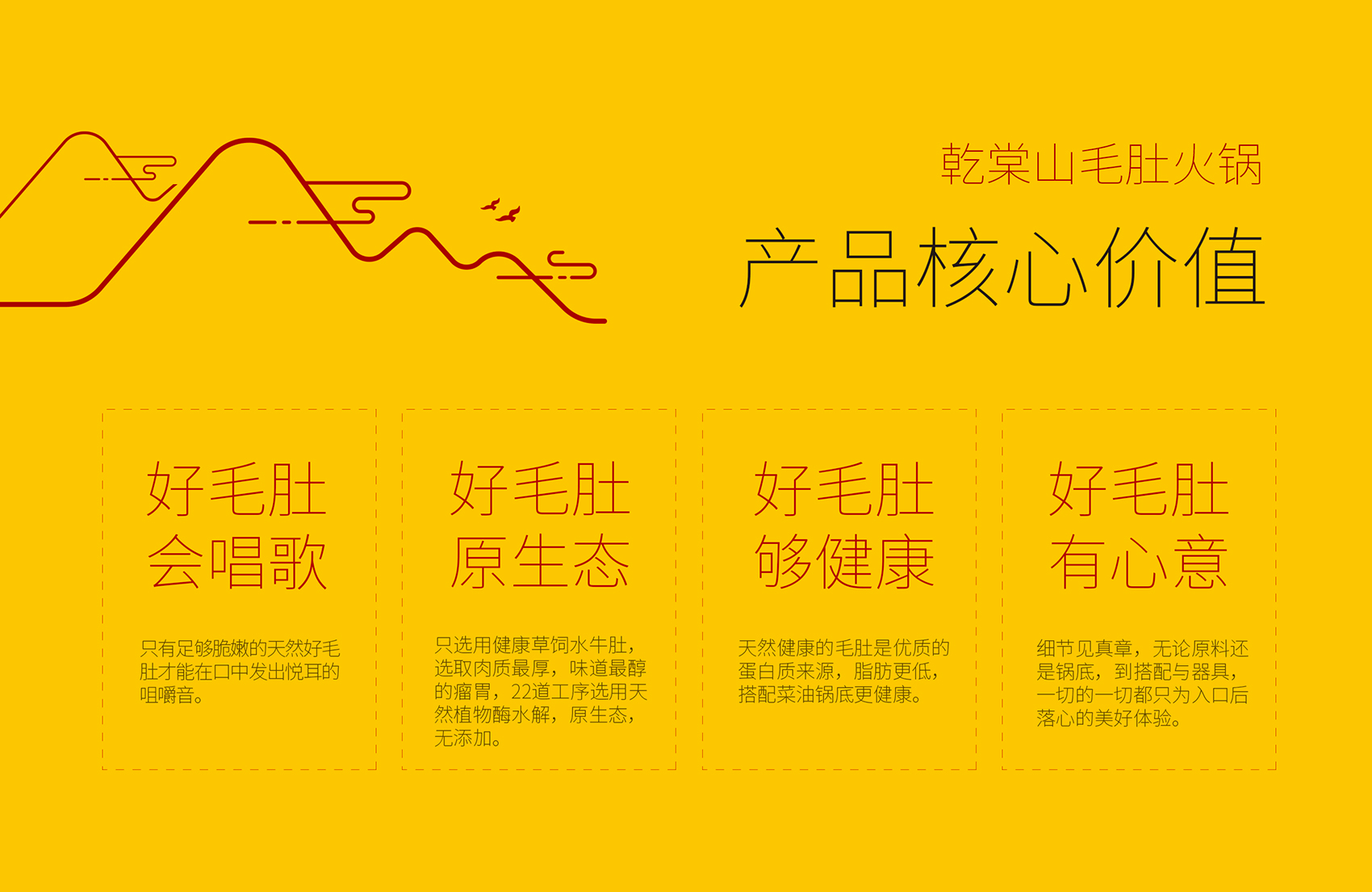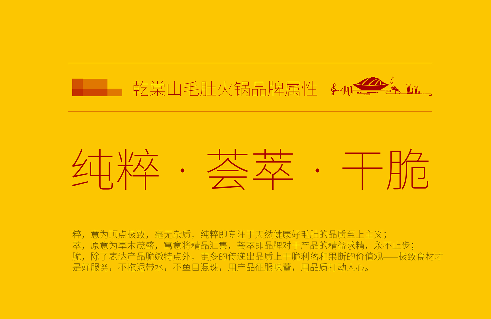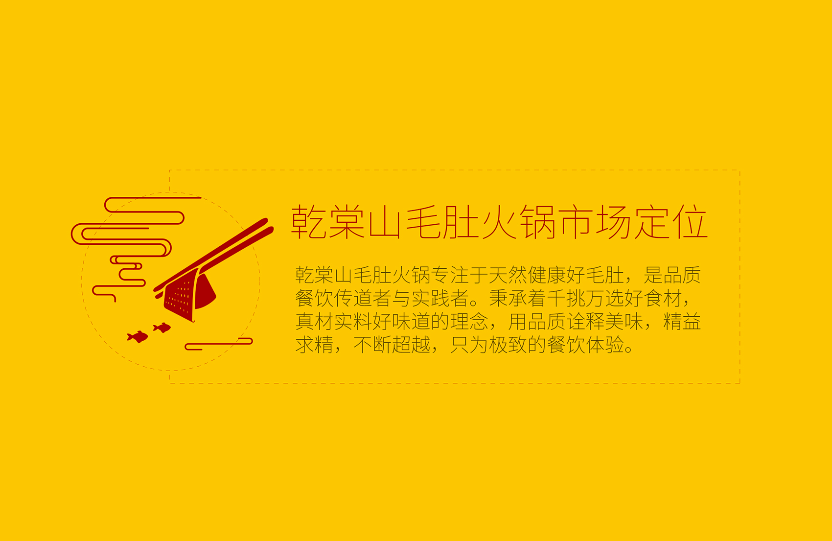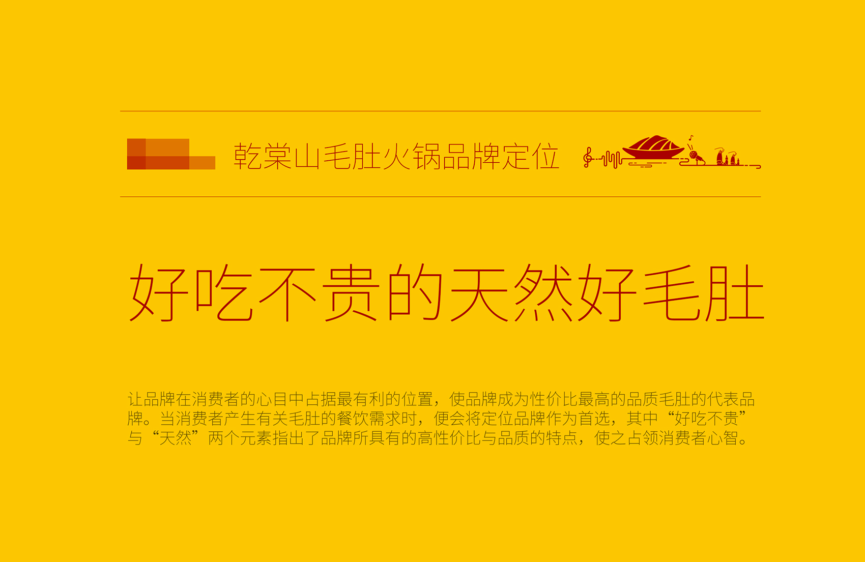 乾棠山毛肚火鍋面臨的競(jìng)爭(zhēng)壓力不但源自火鍋整體市場(chǎng)發(fā)展速度放緩,還源于新品類如何最大程度的突破市場(chǎng),在此基礎(chǔ)上繽策為乾棠山規(guī)劃了從品牌命名、品牌文化、品牌形象及品牌傳播的全案,深入挖掘品牌差異化賣點(diǎn),提煉獨(dú)特文化,并將其融入到品牌形象,植入到品牌空間中,全方位落地執(zhí)行,走出全新的差異化道路。